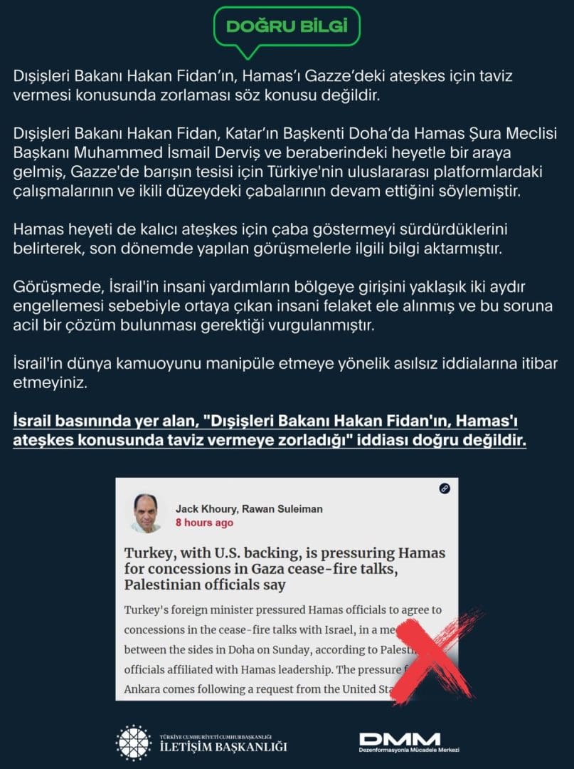 İsrail basınında yer alan, ‘Dışişleri Bakanı Hakan Fidan'ın, Hamas'ı ateşkes konusunda taviz vermeye zorladığı’ iddiası doğru değildir. Dışişleri Bakanı Hakan Fidan’ın, Hamas’ı Gazze’deki ateşkes için taviz vermesi konusunda zorlaması söz konusu değildir. Dışişleri Bakanı Hakan Fidan, Katar’ın Başkenti Doha’da Hamas Şura Meclisi Başkanı Muhammed İsmail Derviş ve beraberindeki heyetle bir araya gelmiş, Gazze'de barışın tesisi için Türkiye'nin uluslararası platformlardaki çalışmalarının ve ikili düzeydeki çabalarının devam ettiğini söylemiştir. Hamas heyeti de kalıcı ateşkes için çaba göstermeyi sürdürdüklerini belirterek, son dönemde yapılan görüşmelerle ilgili bilgi aktarmıştır. Görüşmede, İsrail'in insani yardımların bölgeye girişini yaklaşık iki aydır engellemesi sebebiyle ortaya çıkan insani felaket ele alınmış ve bu soruna acil bir çözüm bulunması gerektiği vurgulanmıştır. İsrail'in dünya kamuoyunu manipüle etmeye yönelik asılsız iddialarına itibar etmeyiniz.